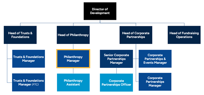 The role sits in the Philanthropy team of the Development Department and is managed by the Head of Philanthropy. The role will line manage one member of staff, the Philanthropy Assistant that will be recruited over this summer. You will work closely with colleagues across both the Development Department and the wider organisation.